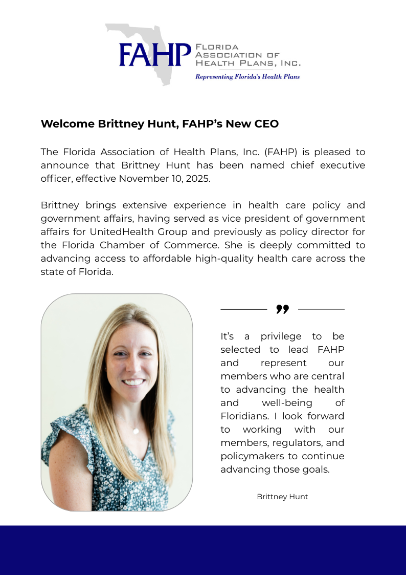 The Florida Association of Health Plans (FAHP) is the statewide trade association representing commercial, Medicaid and Medicare Advantage health insurers and managed care organizations. FAHP members provide access to health care benefits and services to businesses, individuals and families across the state of Florida. FAHP advocates for public policy focused on enhancing access to high quality, affordable health care through a competitive marketplace. Our mission is to improve and protect the health and financial security of Florida families and business community. We do this by: